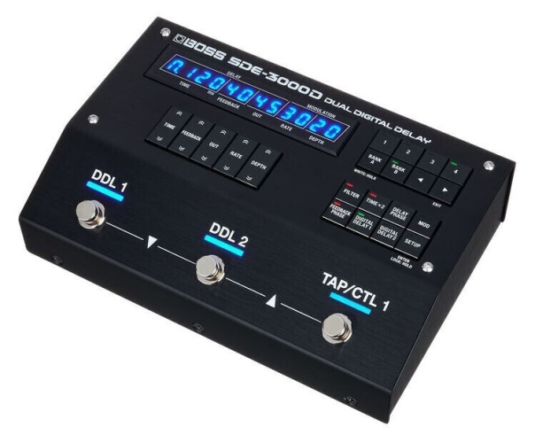 Boss SDE-3000 Dual Delay - цифровой дилей с 2 независимыми эффектами, настройками модуляции, 2 диапазонами времени эффекта, 3 назначаемыми футсвитчами, 100 ячеек паями и разъёмами для подключения внешних педалей или контроллеров.