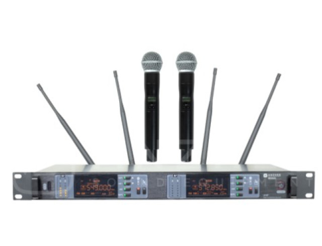 Двухканальная радиосистема с двумя ручными передатчиками. 3000 каналов, 654-714 МГц, сканер частот, ИК синхронизация, динамический диапазон 100 дБ, питание 2хАА, PilotTone, настраиваемый Squelch, сменные головы, True Diversity
