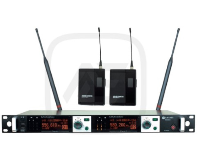 Anzhee RS600 dual BB — 2-канальная радиосистема с 2 поясными передатчиками, частотным диапазоном 656-698 МГц, 5000 каналами, шагом частоты 50 МГц, функцией сканера частот, динамическим диапазоном 100 дБ, питанием 2хАА.