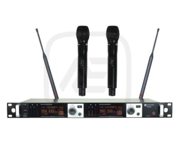 Anzhee RS600 dual HH — 2-канальная радиосистема с 2 ручными микрофонами-передатчиками, частотным диапазоном 656-698 МГц, 5000 каналами, шагом частоты 50 МГц, функцией сканера частот, динамическим диапазоном 100 дБ, питанием 2хАА.