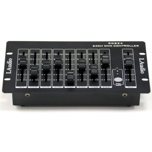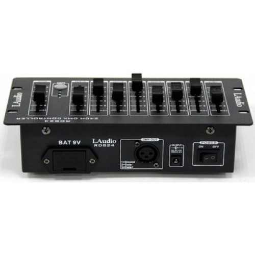 Контроллер поддерживает работу с 24 DMX каналами по протоколу DMX512. Для управления устройство оборудовано 8-ю отдельными фейдерами, отвечающими за определенный канал и одним мастер фейдером. На задней панели расположены разъем для адаптера питания, выход DMX (XLR, 3-pin, мама),слот для батарейки на 9 В и кнопка питания.