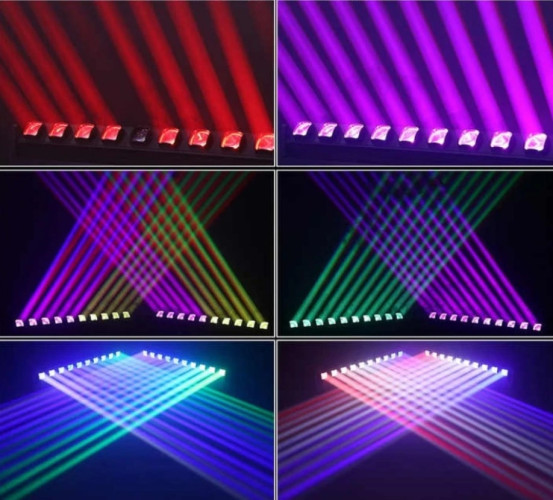 Она оснащена 10 линзами CREE LED и 60 светодиодами SMD5050 RGB. В режиме DMX вам доступны следующие функции: мастер диммер, смена цвета, активация звуком, стробоскоп, пиксель-контроль. В автономном режиме вам доступны авто-программы, смена цвета, активация звуком, стробоскоп и подключение Master-Slave.