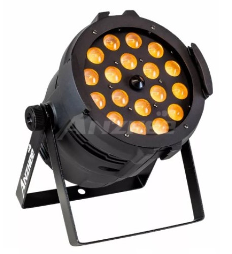Anzhee P18x18-ZOOM — светодиодный прожектор PAR-типа с 18 мультичиповыми светодиодами по 18 Вт каждый, цветосмешением RGBWA+UV, моторизированным зумом с углом раскрытия луча от 10° до 60°, DMX-управлением и активным охлаждением.