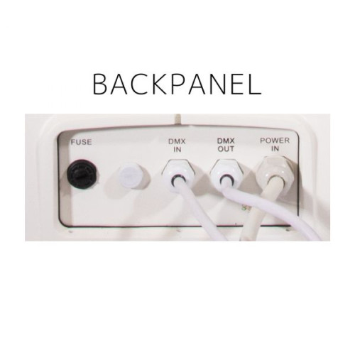 Подключение выполняется на стандартных разъемах 3-pin XLR In/Out. Прибор имеет класс защиты IP20. Устройство отлично подойдет для создания впечатляющих световых шоу в затемненном помещении.