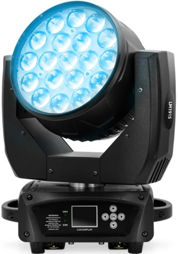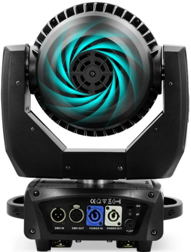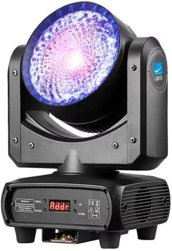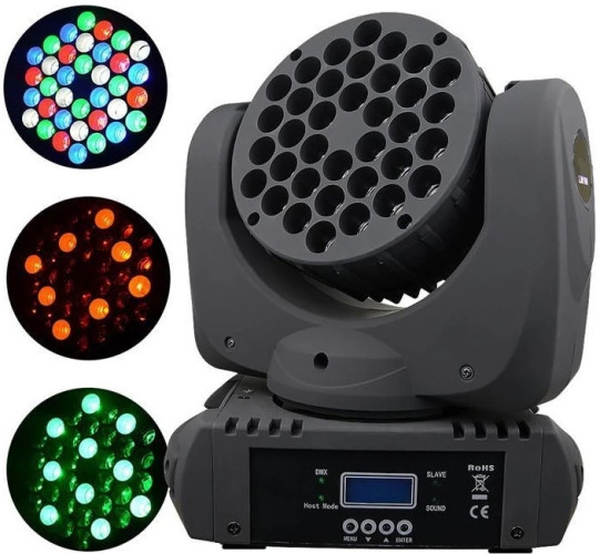 Данная модель за счет обилия функций и стильного дизайна станет отличным дополнением для любой концертной площадки. Здесь есть 36 светодиодов RGBW мощностью по 3 Вт, обеспечивающих яркий, насыщенный свет. Управлять прибором можно как непосредственно с лицевой панели (дисплей и 4 кнопки), так и с помощью внешнего оборудования по DMX или с других приборов в цепи, а также возможен автоматический контроль звуком через встроенный микрофон. MH363 поддерживает стробоскоп и эффект затвора. На задней панели есть вход и выход DMX с коннекторами XLR. Еще сзади предусмотрены вход и выход для питания.