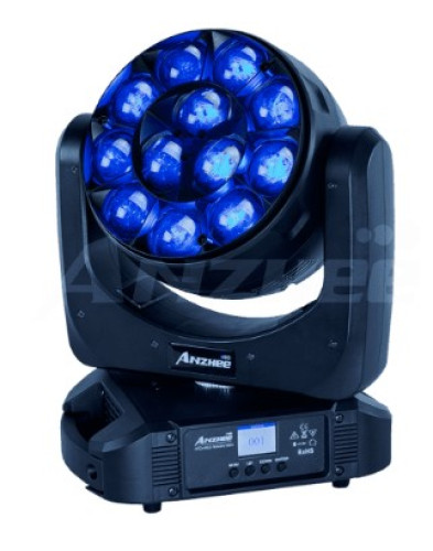 Anzhee H12x40Z-WASH MKII — светодиодный прожектор типа вращающаяся голова Wash/Beam с 36 светодиодами мощностью 4 Вт, углом раскрытия луча 3.5°-45, управлением DMX512 (116/21 каналов, 2 режима), режимом Master/Slave, диммером, стробоскопом, звуковой активацией, автоматическими программами, входами и выходами 3-контакнтными XLR, входным и сквозным PowerCon, чёрного цвета.