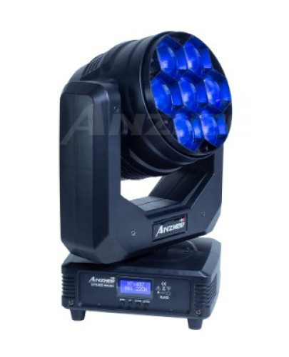 Anzhee H7x40Z-WASH — светодиодный прожектор типа вращающаяся голова Wash/Beam с 7 светодиодами RGBW мощностью 40 Вт, зумом, углом раскрытия луча 6°-45°, управлением DMX512, режимом Master/Slave, диммером, стробоскопом, 3-контакнтными XLR входами/выходами, входным и сквозным PowerCon, чёрного цвета.