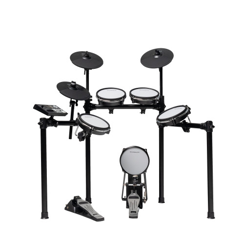 Данная модель включает 12-дюймовый двухзонный пэд малого барабана, три 10-дюймовых двухзонных пэда томов, 8-дюймовый пэд бас-барабана и тарелки: два 12-дюймовых двухзонных крэша, 12-дюймовый двухзонный хай-хэт с отдельной стойкой, а также 14-дюймовый трехзонный райд. Важно отметить, что все пэды барабанов имеют качественные сетчатые пластики, которые обеспечивают максимально реалистичный отскок и отличаются износостойкостью.