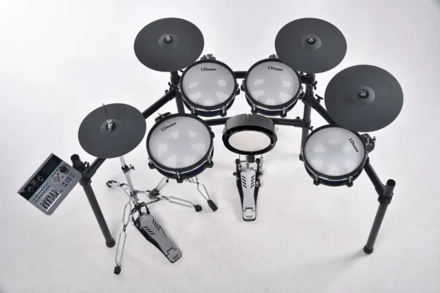 LDrums MK-5L — электронная ударная установка с звуковым модулем DSP-5002, 10-дюймовым пэдом малого барабана, 3 пэдами томов на 10 дюймов, 10-дюймовым пэдом бас-бочки, 12-дюймовым пэдом тарелки хай-хета, райда и краша, а также 2 ножными контроллерами басового барабана и хай-хэта.