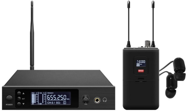 Передатчик радиосистемы имеет высокопрочный алюминиевый корпус, который оснащен ручкой громкости, ярким светодиодным дисплеем и выходом для подключения наушников. Рабочая частота передатчика - 710 - 726 MГц.